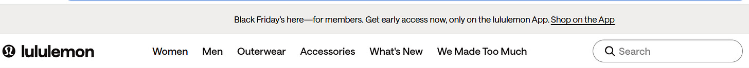 Member clubs tend to offer first dibs on new product drops, exclusive colors and sizes, and in-person experiences. They help brands develop “power users”, who tend to be their most loyal (read: profitable) customers. Right now, Lululemon is offering early access to their Black Friday sale for members only. Last holiday shopping season, I bought from an Alo Yoga member sale.