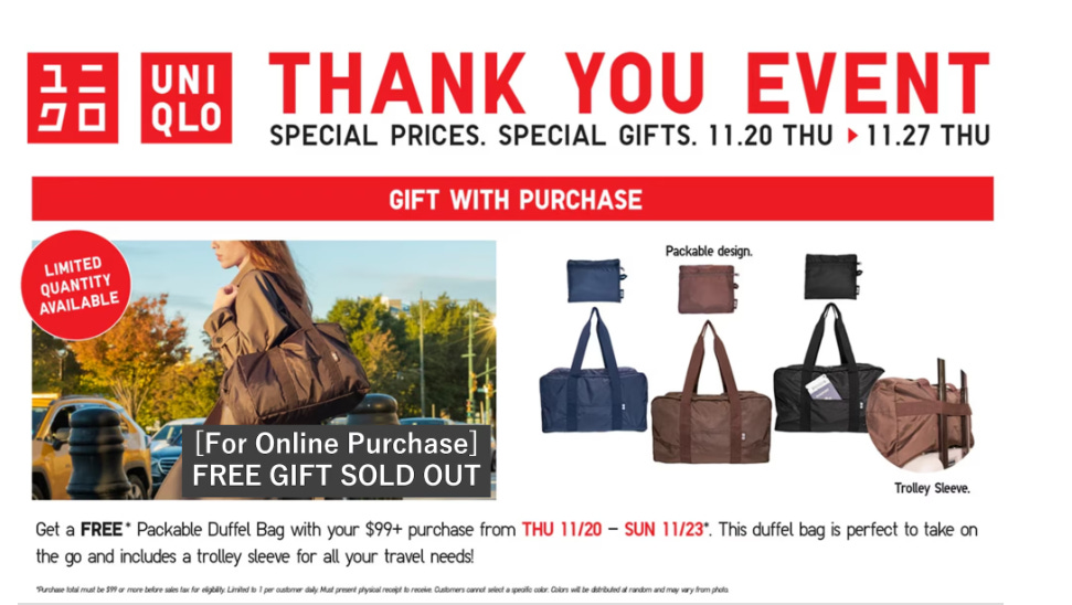 Check out Uniqlo’s gift with purchase (on orders of $99+). You’ll receive a free duffle bag if you hit the order threshold. But in fine print, Uniqlo mentions that you don’t get to choose the color. This could indicate that Uniqlo made several duffle bags in colors that flopped and needed a way to get rid of this inventory.