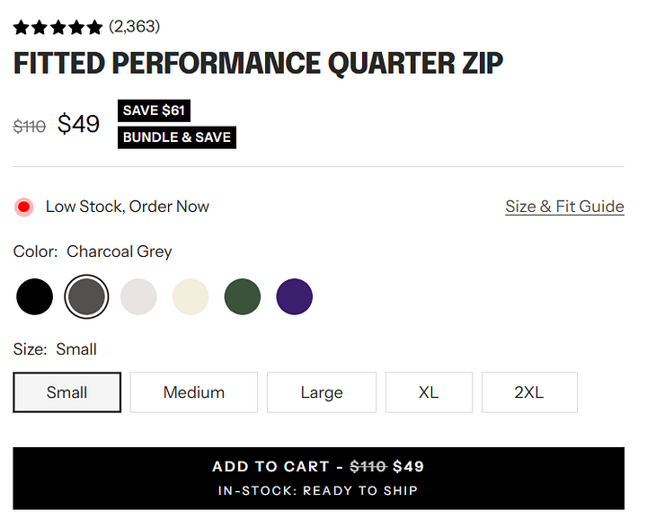 For example, athleticwear brand Haus is offering 50%+ discounts across their catalog. Check out this quarter zip. Normally priced at $110, it’s currently on sale for $49.