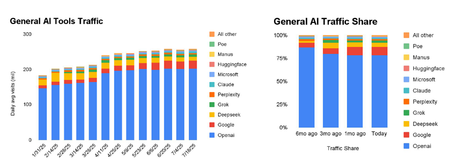 Perplexity, Claude, and Grok sure do get plenty of media attention, but they’re mostly a rounding error when it comes to overall traffic share.