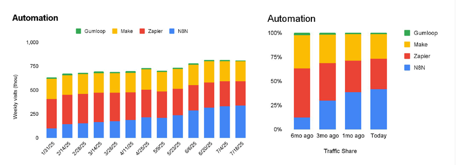 Perhaps I’m in an AI bubble. However, I believe software like n8n and Zapier will continue to rise in popularity (also depicted in the rising weekly traffic numbers below). It will become increasingly the norm to automate both personal and professional tasks. Unless you have access to robust enterprise software, you’ll rely on building workflows to connect programs and automate processes with the help of these little-to-no-code platforms.